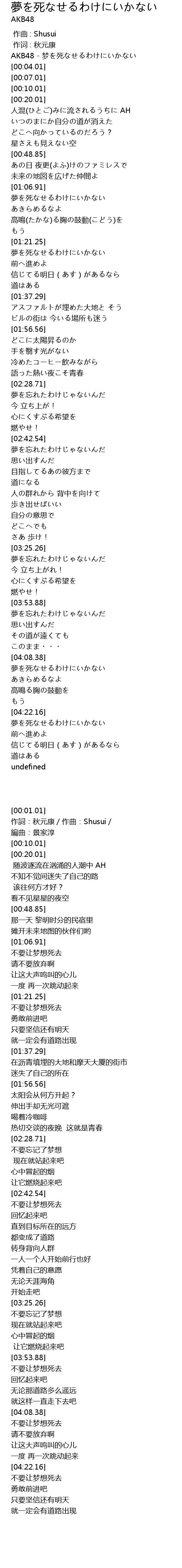 | [00:01.01] | AKB48 - 梦を死なせるわけにいかない |