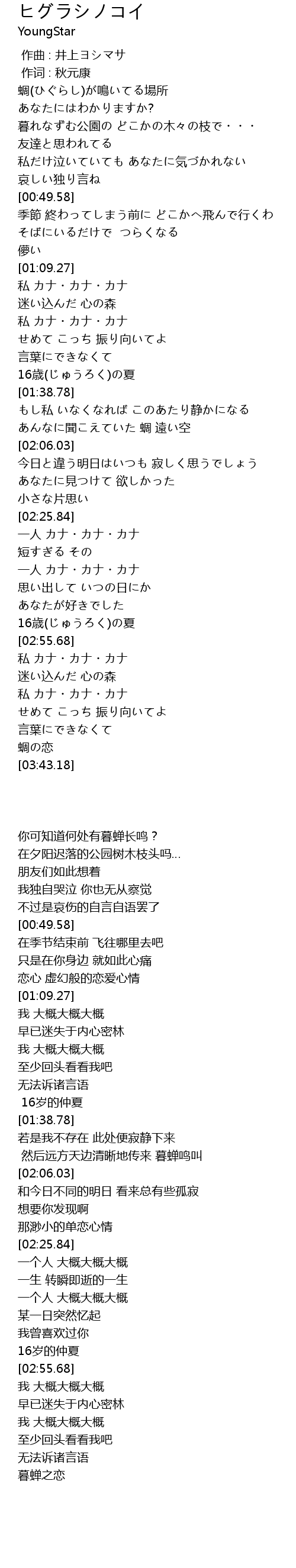| [00:12.11] | 蜩(ひぐらし)が鳴いてる場所 あなたにはわかりますか? |