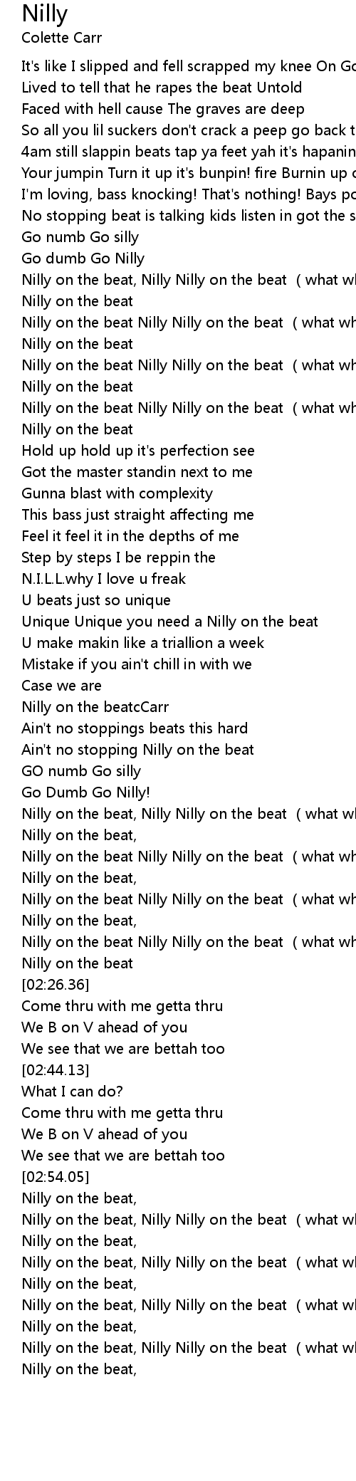 | [03:12.01] | Nilly on the beat, Nilly Nilly on the beat what what what |