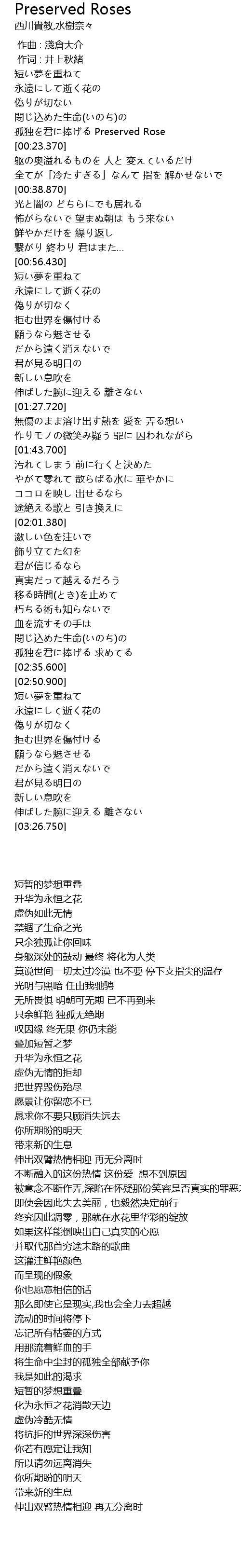 | [00:17.430] | 孤独を君に捧げる Preserved Rose |