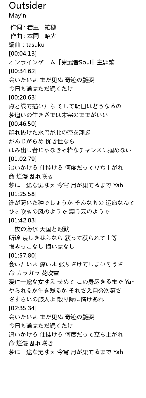 | [00:23.92] | オンラインゲーム「鬼武者Soul」主题歌 |