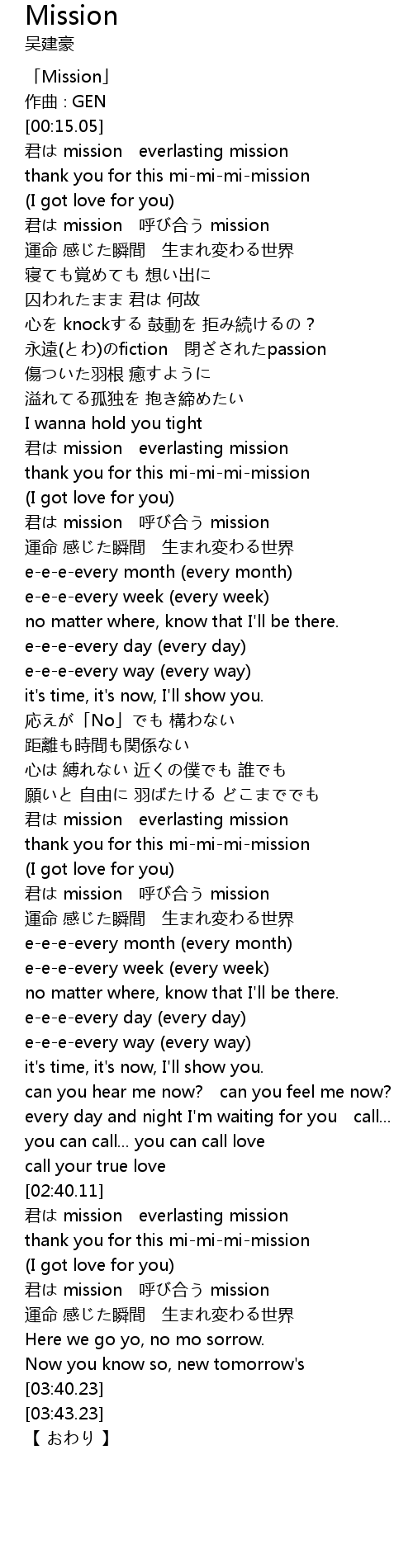 | [00:01.05] | 「Mission」 |