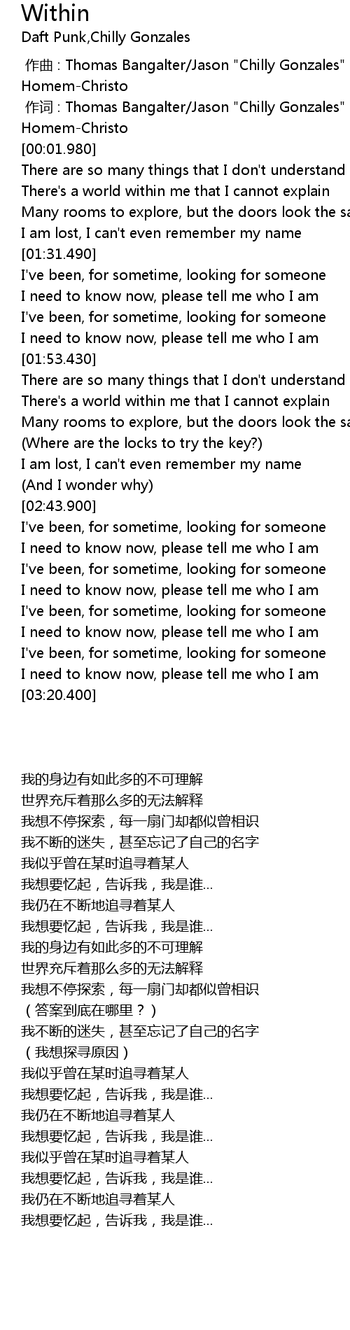 | [00:00.660] | 作词 : Thomas Bangalter/Jason "Chilly Gonzales" Beck/de Homem-Christo |