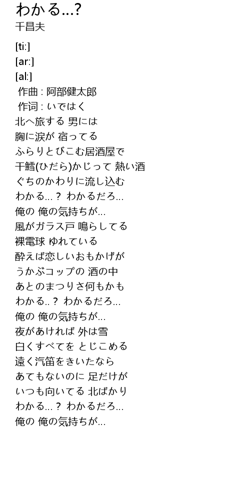 | [00:56.82] | 干鱈(ひだら)かじって 熱い酒 |