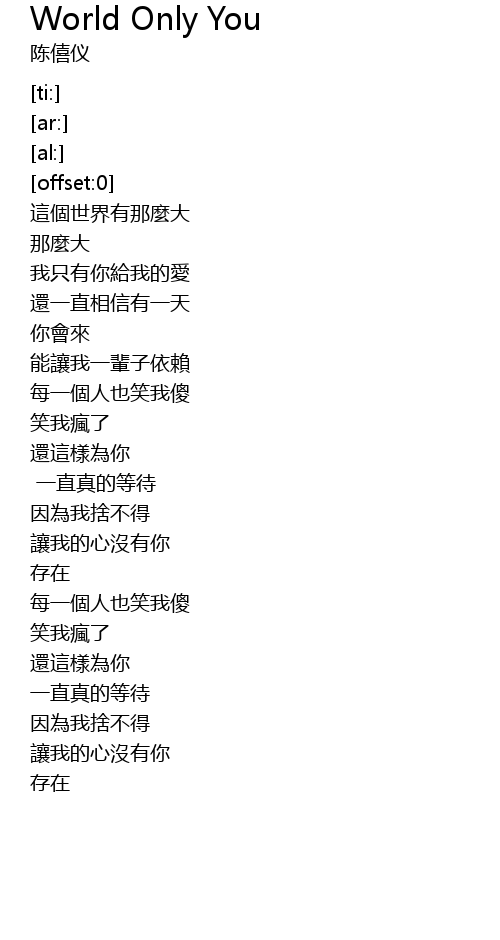 | [01:07.09] | wǒ zhǐ yǒu nǐ gěi wǒ de ài |