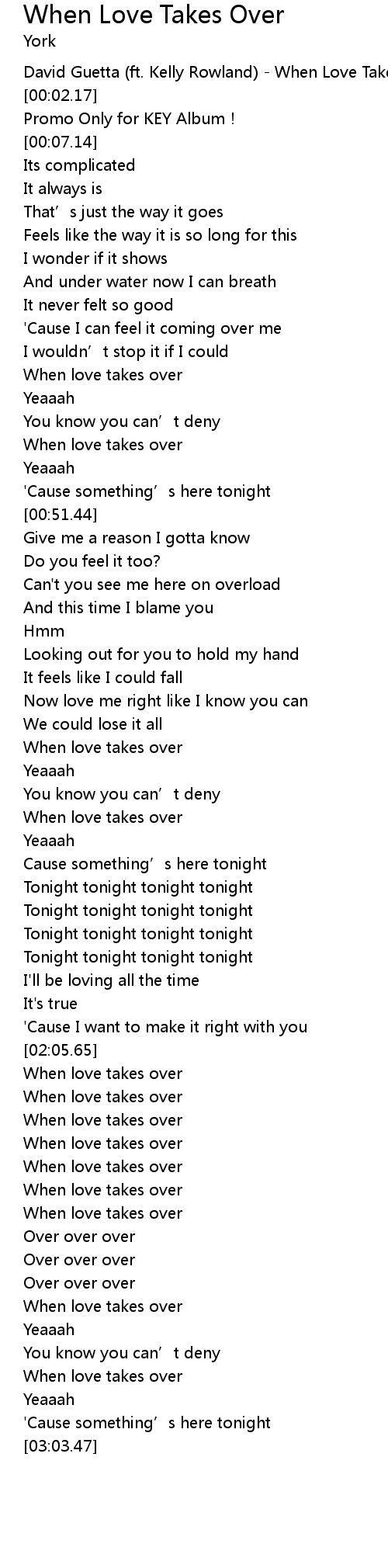 | [00:00.59] | David Guetta ft. Kelly Rowland When Love Takes Over |