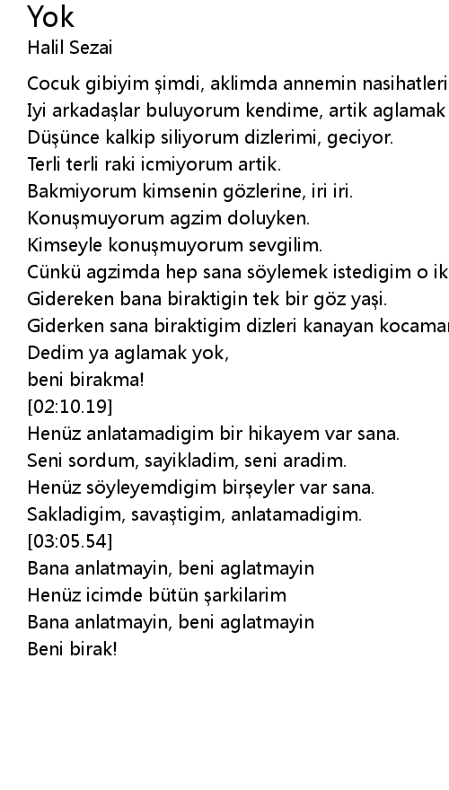| [00:36.26] | Iyi arkada lar buluyorum kendime, artik aglamak yok. |