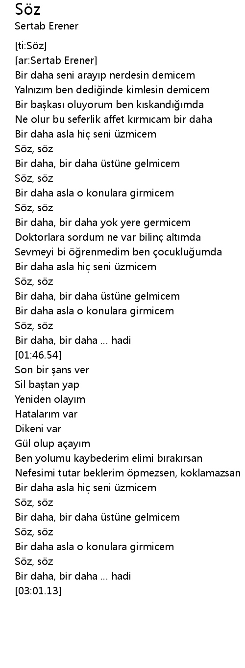 | [00:48.95] | Bir daha asla hi seni ü zmicem |