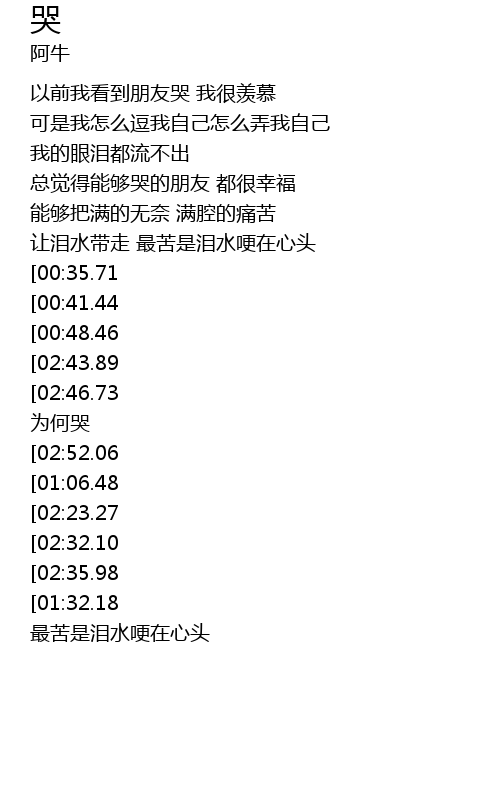 | [03:03.01][02:46.73][02:25.83][02:09.95][01:12.69][00:56.86] | 才懂得何为哭 为何哭 |
