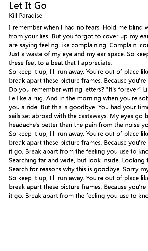 So keep it up, I'll run away. You're out of place like the devil on a Sunday. So break apart these picture frames. Because you're to evil for love anyway. So let it go. Break apart from the feeling you use to know. |