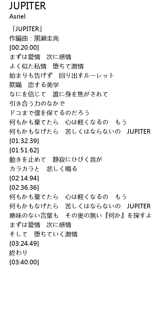 | [02:49.47] | 何もかもなげたら 苦しくはならないの JUPITER もう |