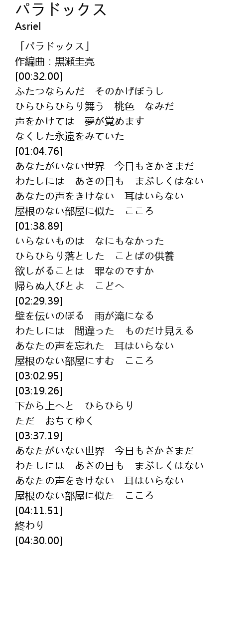 | [03:37.77] | あなたがいない世界 今日もさかさまだ |