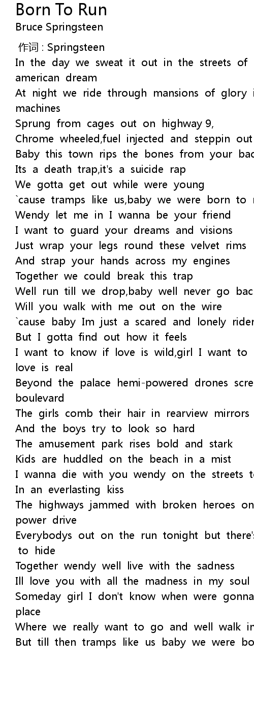 | [00:47.570] | `cause tramps like us,baby we were born to run |