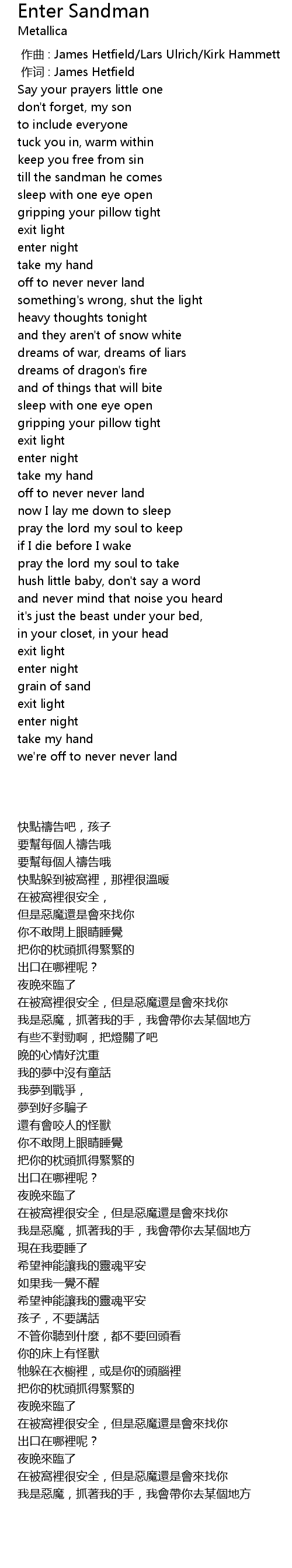 | [00:00.00] | 作曲 : James Hetfield/Lars Ulrich/Kirk Hammett |