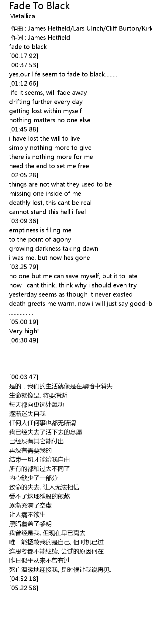 | [00:00.00] | 作曲 : James Hetfield/Lars Ulrich/Cliff Burton/Kirk Hammett |