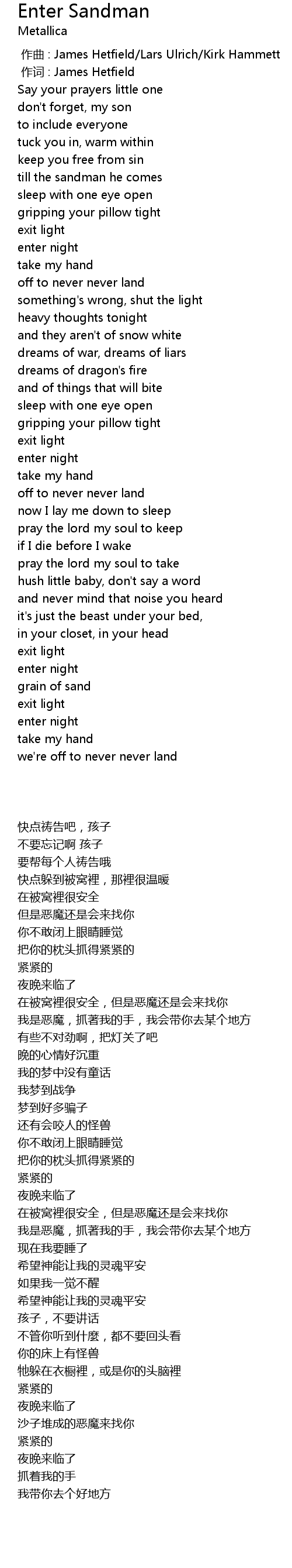 | [00:00.00] | 作曲 : James Hetfield/Lars Ulrich/Kirk Hammett |
