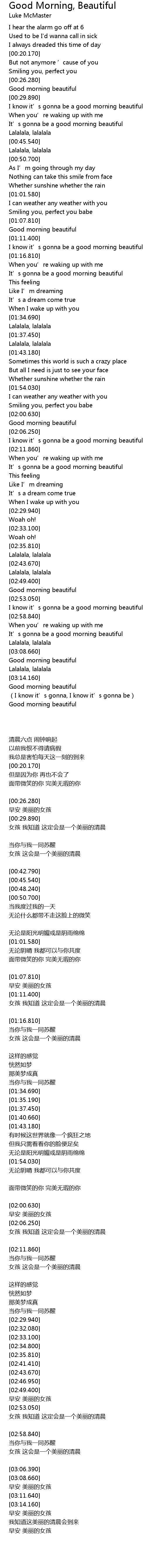| [00:30.770] | I know it' s gonna be a good morning beautiful |