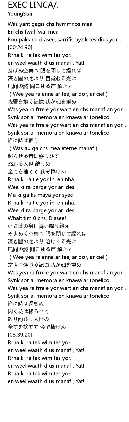 | [02:53.20] | 常世に通づる記憶 我が魂を重ぬ |
