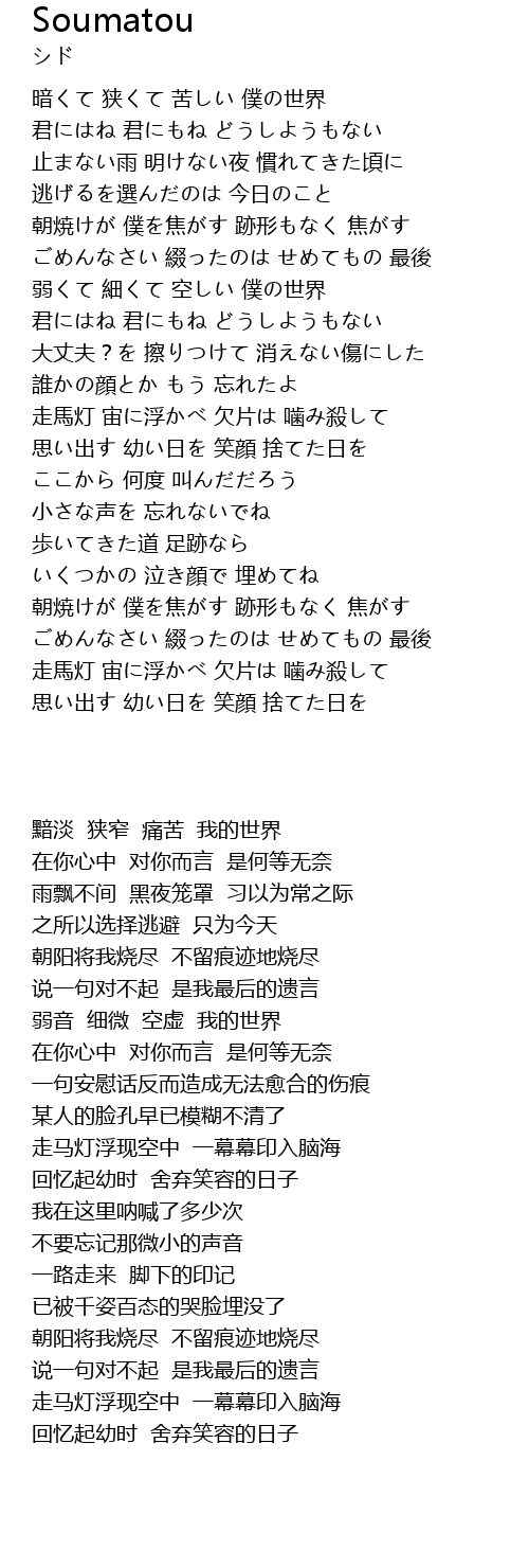 | [03:12.430] | 走馬灯 宙に浮かべ 欠片は 噛み殺して |