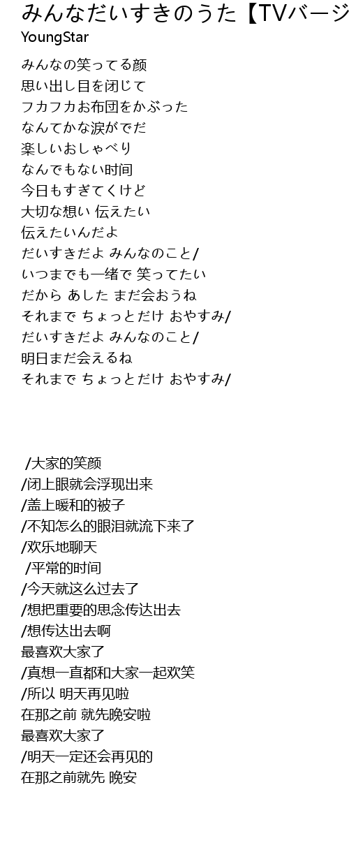 | [01:47.67] | だいすきだよ みんなのこと/ |