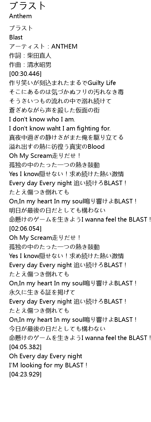 | [01:34.368] | Every day Every night 追い続けろBLAST! |