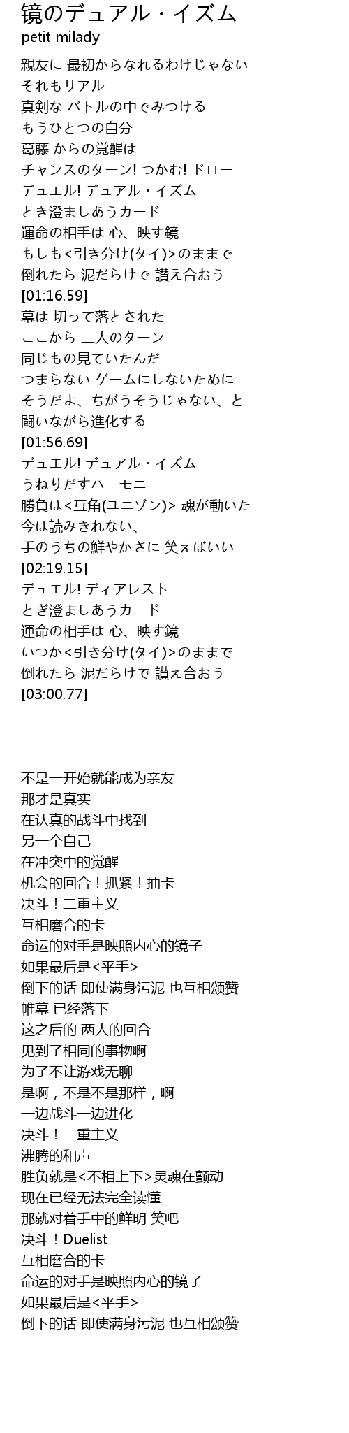 | [02:03.05] | 勝負は<互角(ユニゾン)> 魂が動いた |