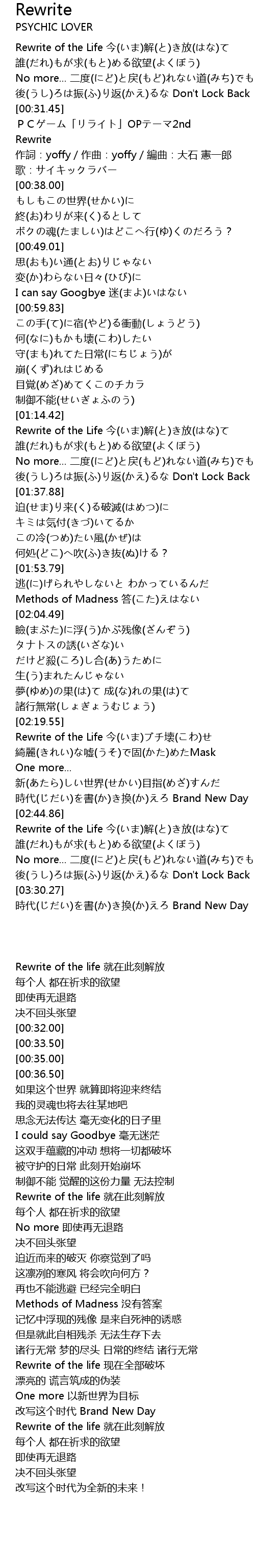 | [02:19.81] | Rewrite of the Life 今(いま)ブチ壊(こわ)せ |