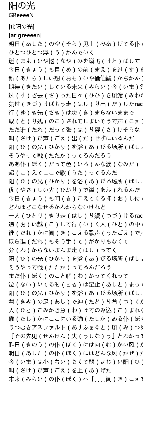 | [01:26.185] | 阳(ひ)の光(ひかり)を浴(あ)びる场所(ばしょ)へ |