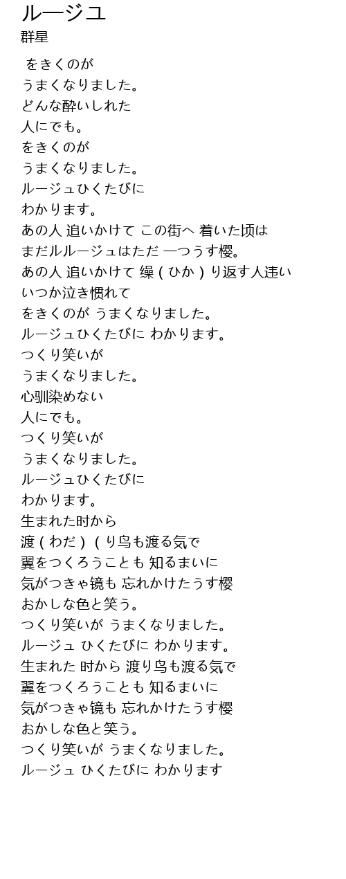 | [01:10.169] | まだルルージュはただ 一つうす樱。 |
