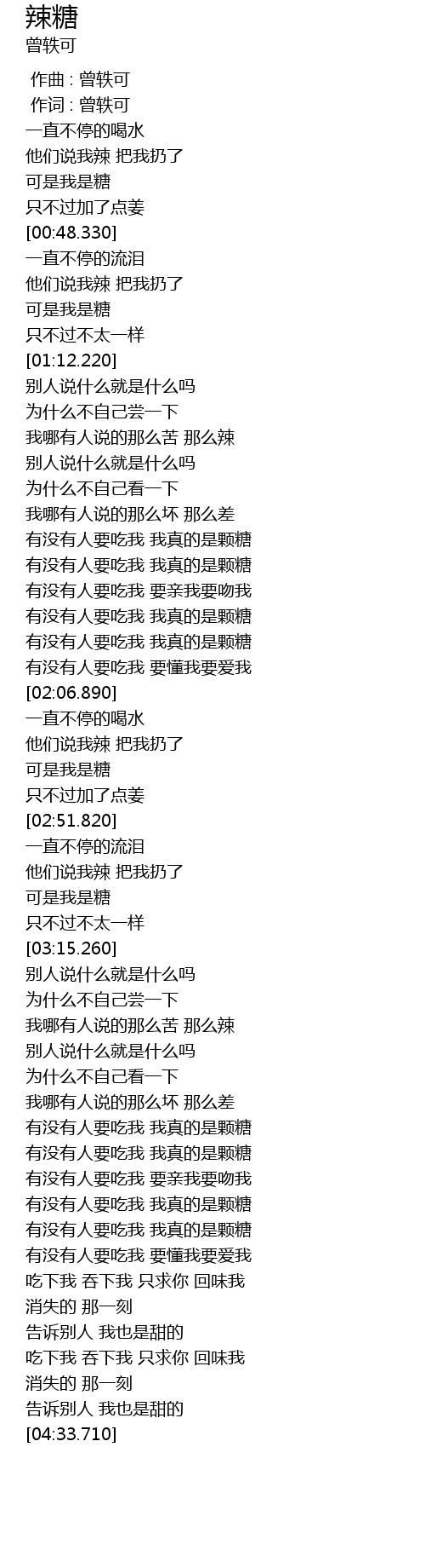| [03:56.630] | 有没有人要吃我 我真的是颗糖 |