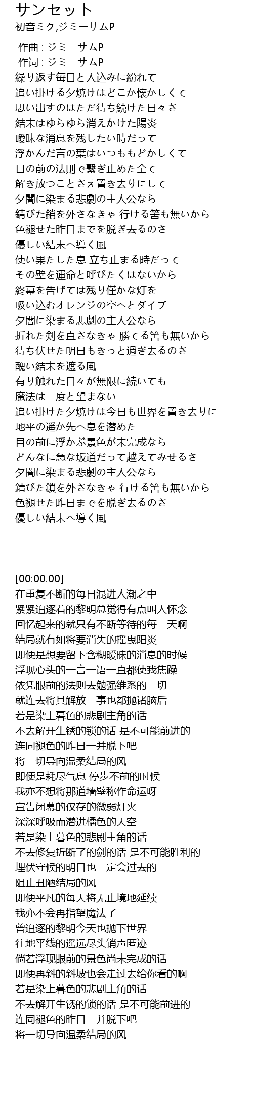 | [03:09.55] | 追い掛けた夕焼けは今日も世界を置き去りに |