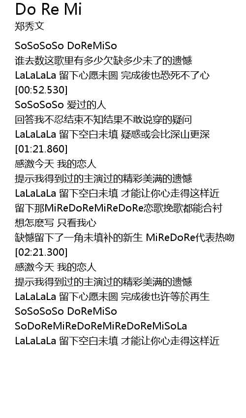 | [01:53.20] | liú xià nà MiReDoReMiReDoRe liàn gē wǎn gē dōu néng hé chèn |
