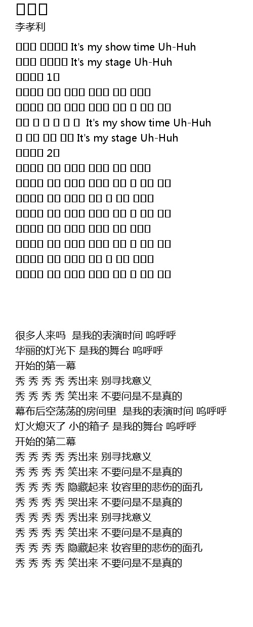 | [01:54.77] | 秀 秀 秀 秀 隐藏起来 妆容里的悲伤的面孔 |