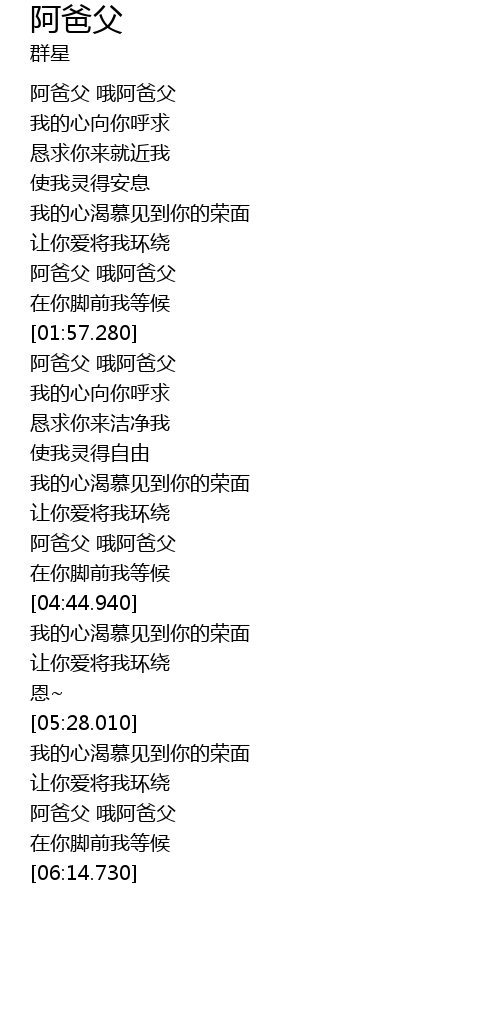| [01:36.550] | 阿爸父 哦阿爸父 |