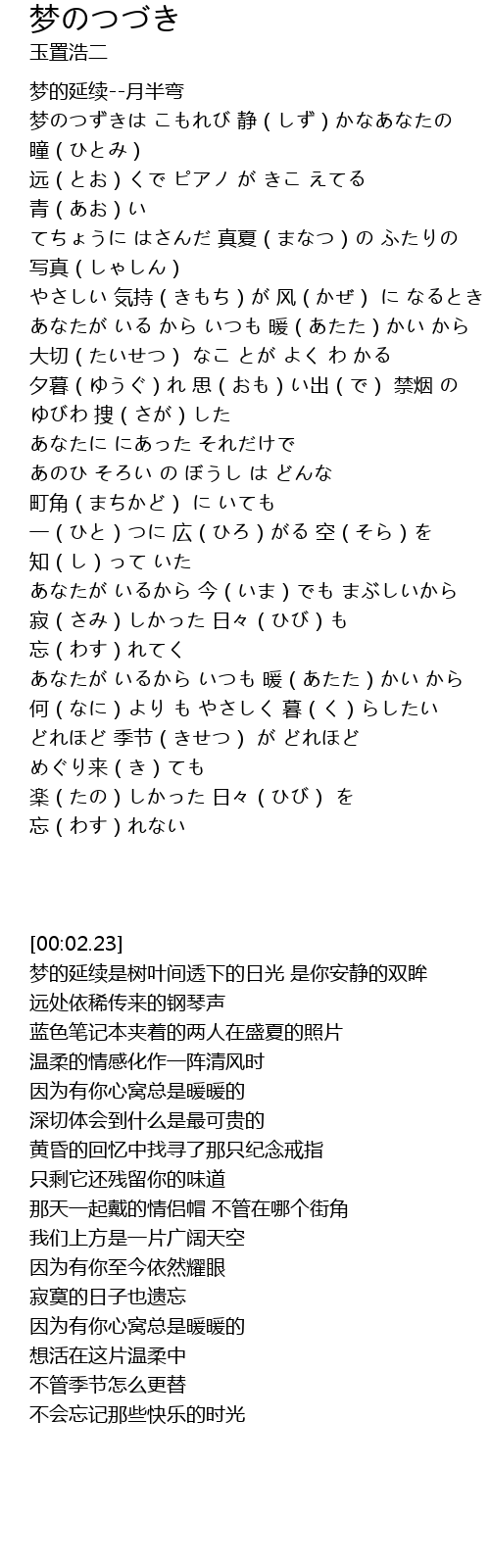 | [00:32.23] | 梦のつずきは こもれび 静(しず)かなあなたの 瞳(ひとみ) |