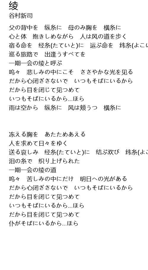 | 送る哀しみ 经糸(たていと)に 结ぶ欢び 纬糸(よこいと)に | |