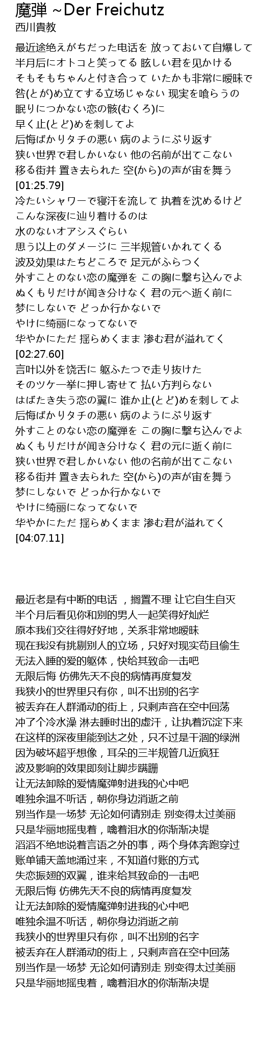 | [01:59.71] | 让无法卸除的爱情魔弹射进我的心中吧 |