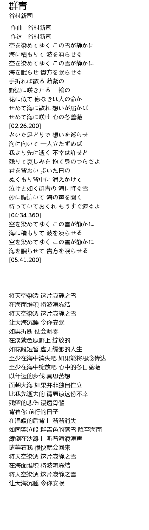 | [03:56.930] | 泣けと如く群青の 海に降る雪 |