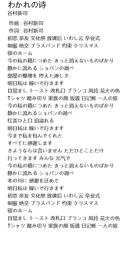 | [04:21.95] | 明日私は 嫁いで行きます |