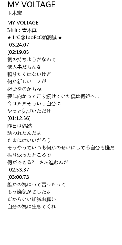 | [02:04.33][03:00.73][03:15.14] | 誰か僕の背中を叩いてくれよ |