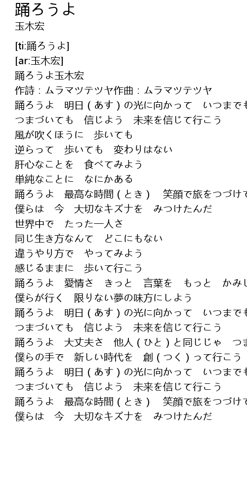 | [00:19.38] | 踊ろうよ 明日(あす)の光に向かって いつまでも |