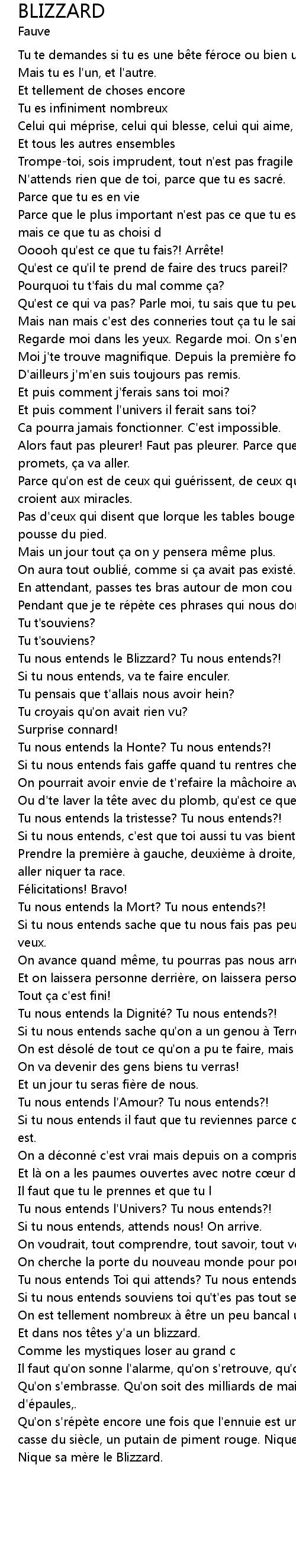 | Qu'on s'répète encore une fois que l'ennuie est un crime. Que la vie est un casse du siècle, un putain de piment rouge. Nique sa mère le Blizzard. | |