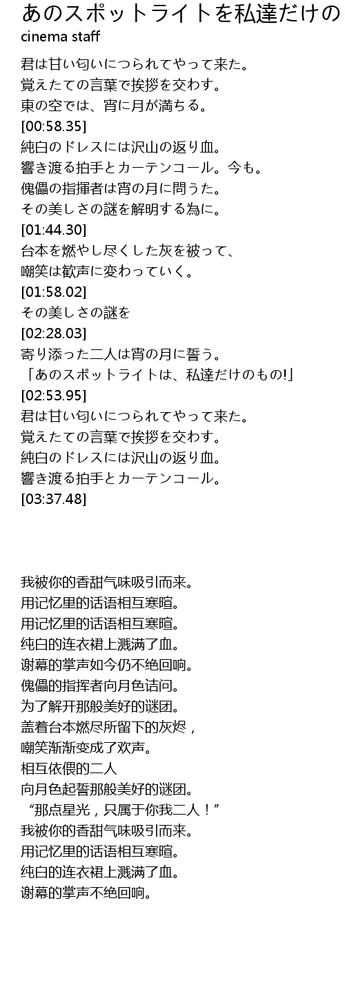| [01:11.48] | 響き渡る拍手とカーテンコール。今も。 |