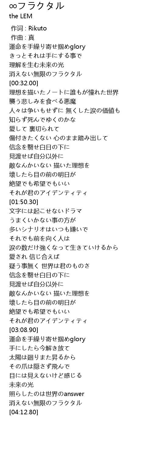 | [00:15.60] | 消えない無限のフラクタル |