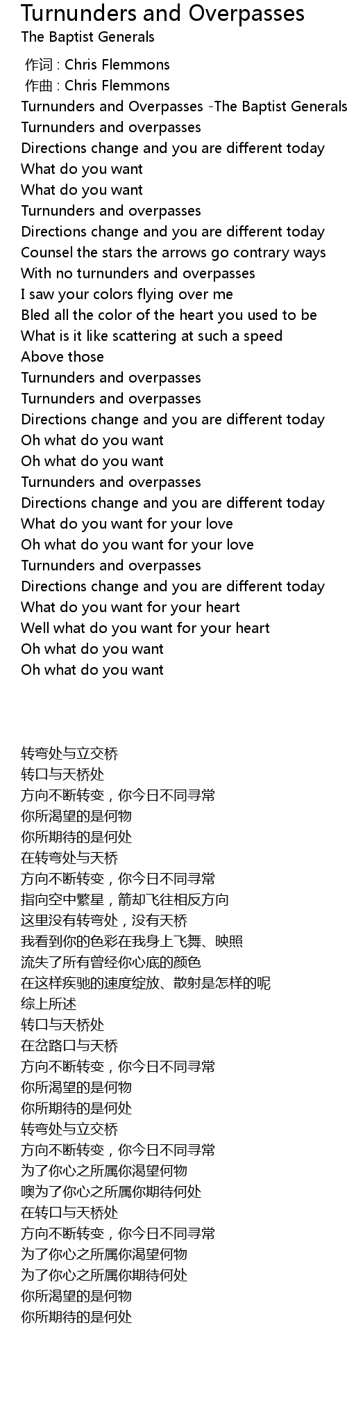 | [00:00.486] | Turnunders and Overpasses -The Baptist Generals |