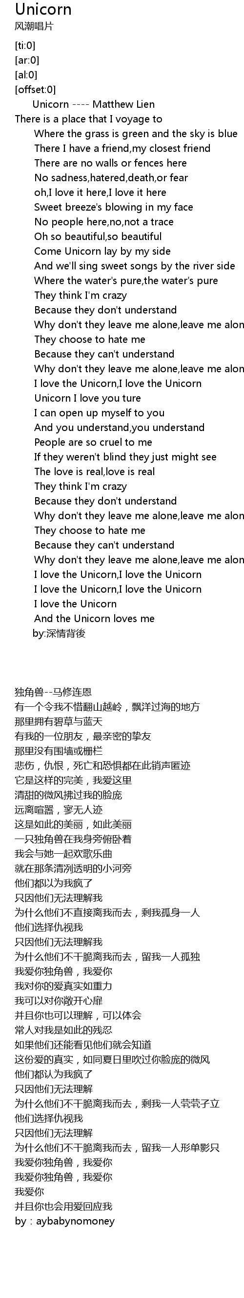 | [00:03.13] | Unicorn ---- Matthew Lien |