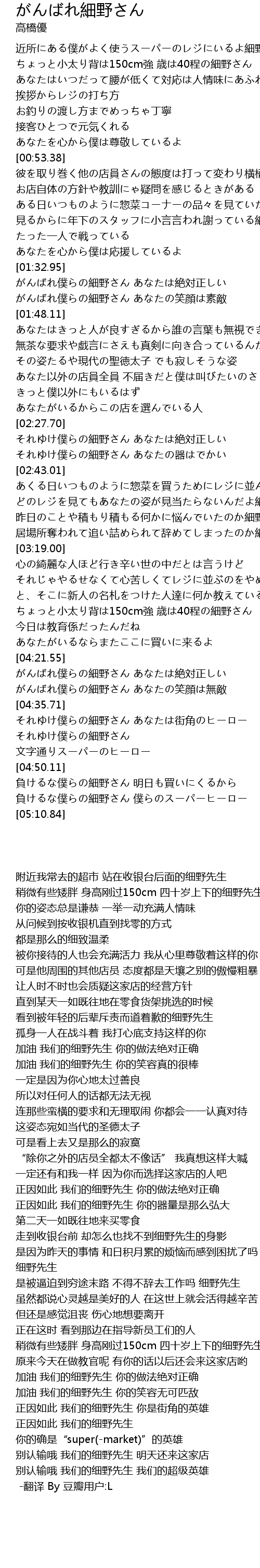 | [04:50.55] | 負けるな僕らの細野さん 明日も買いにくるから |