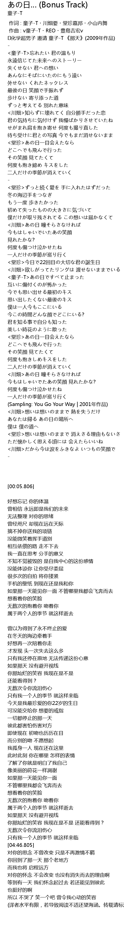 | [00:05.806] | ♪化学超男子 邀请 童子-T 《那天》(2009年作品) |