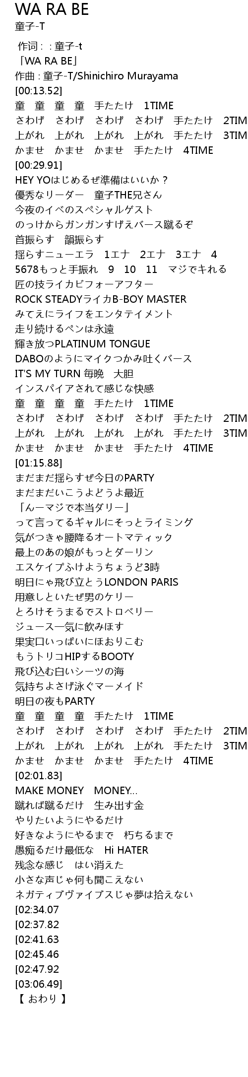| [02:49.37][02:34.07] | 童 童 童 童 手たたけ 1TIME |