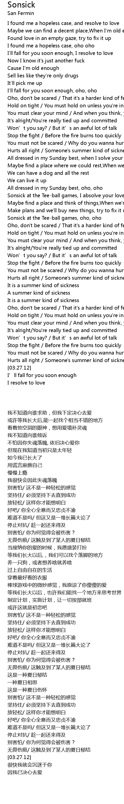 | [03:21.95] | Hurts all right Someone' s summer kind of sickness |